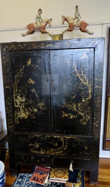 Stort skåp, svart lack med gulddekor. Skador och reparationer.