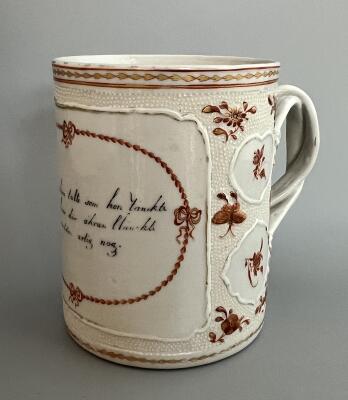 Stop med hänkel, dekor med text i emaljfärg och ...