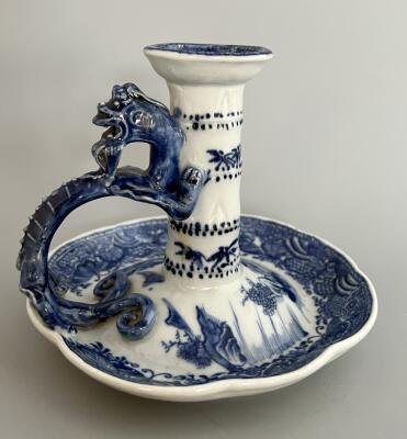 Ljusttake med drakhänkel. Dekor i blå underglasy...