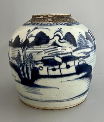 Ingefärskrus med dekor av flodlandskap i blå und...
