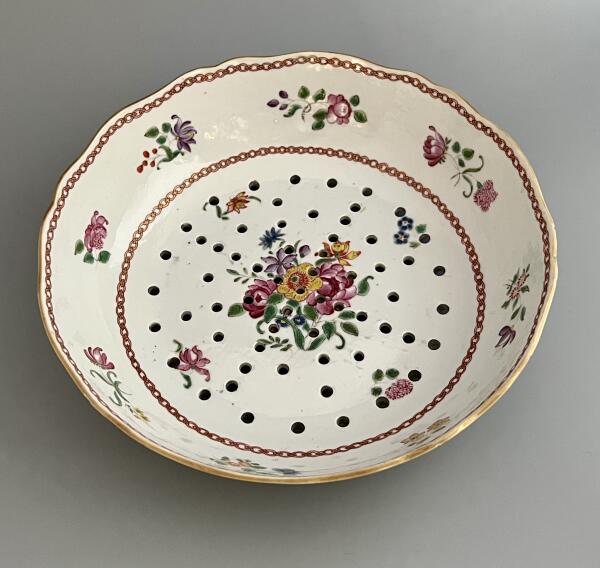 Frukt eller grönsaksfat med hål i botten, dekor i famille rose av blommor.