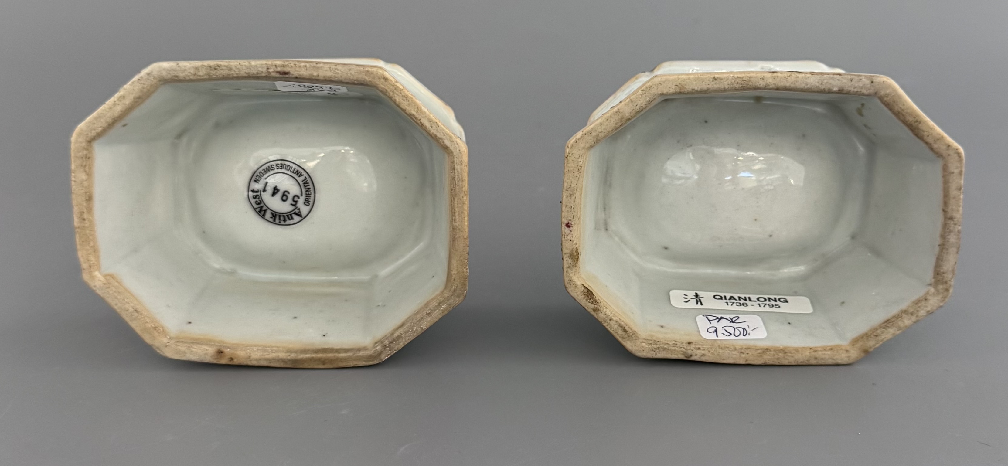 Vackra saltkar med emaljdekor famille rose. Dekor av monogram.