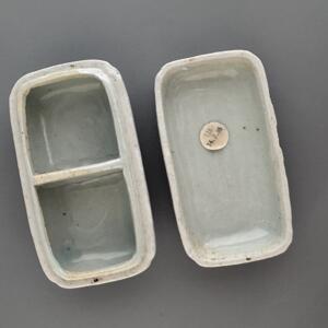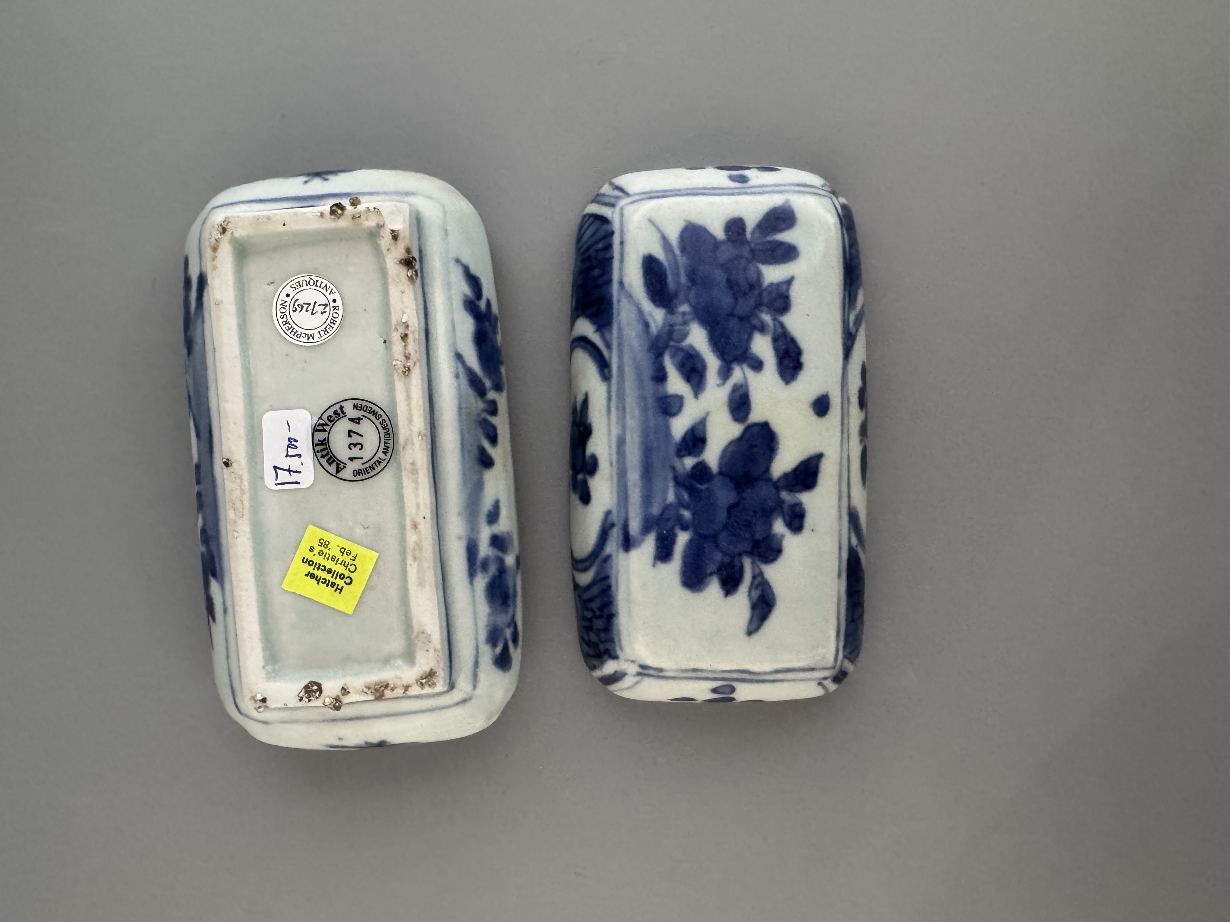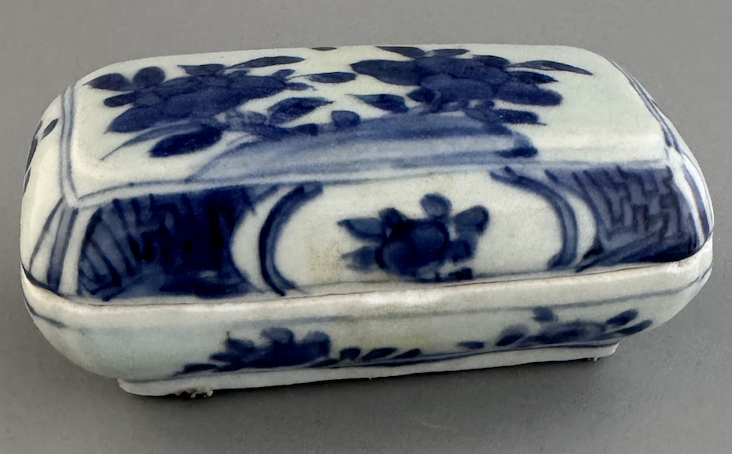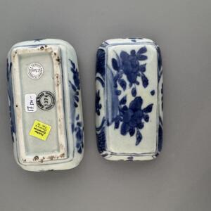 En vacker dosa med lock från Hatcher Collection. Blå underglasyr. Ming Transition ca 1640