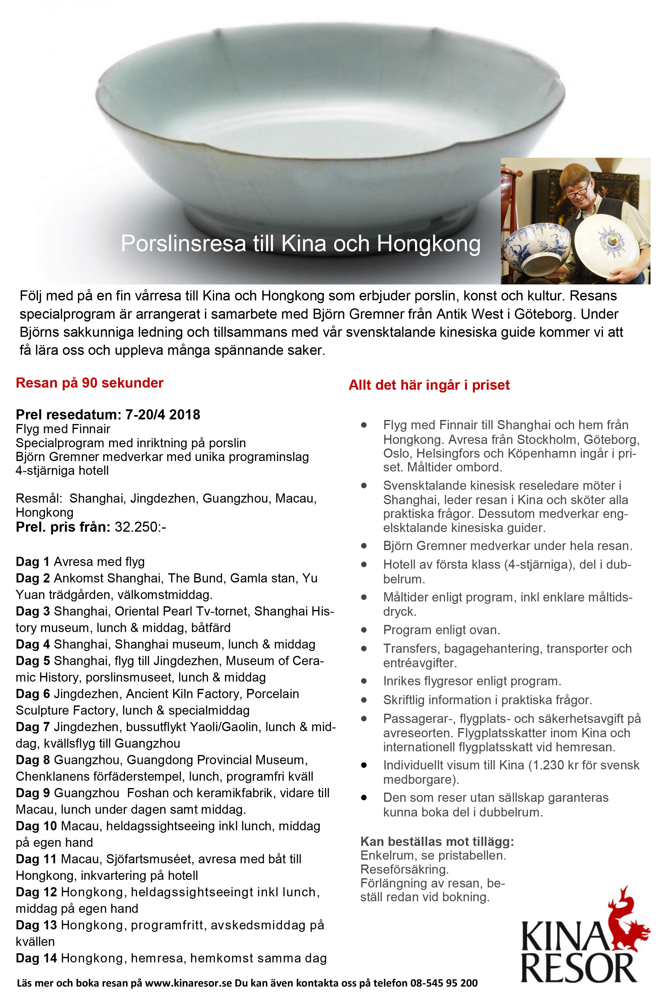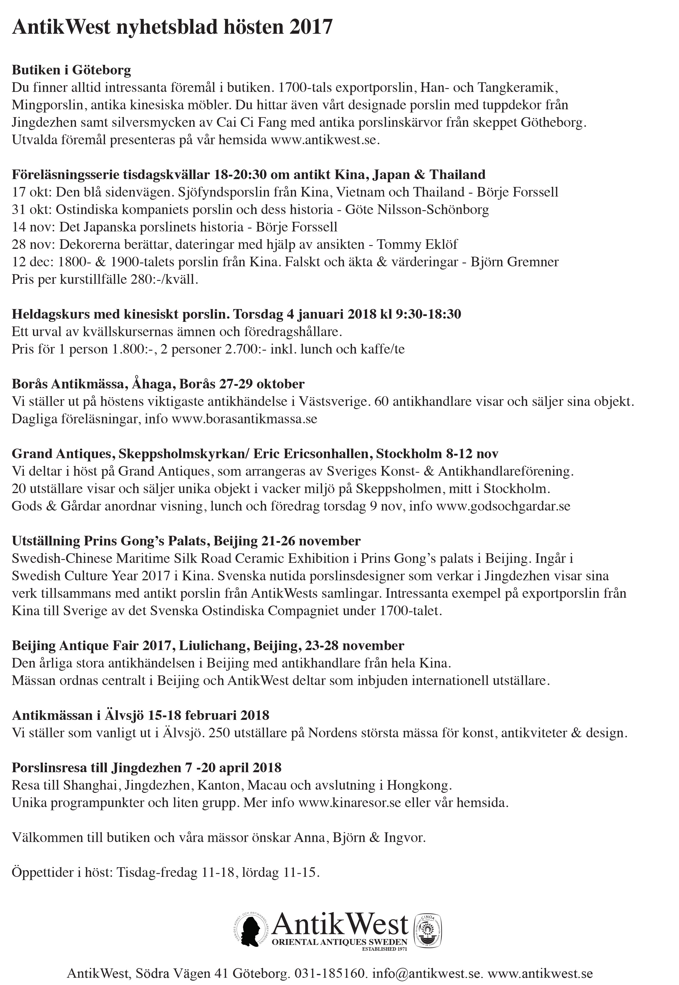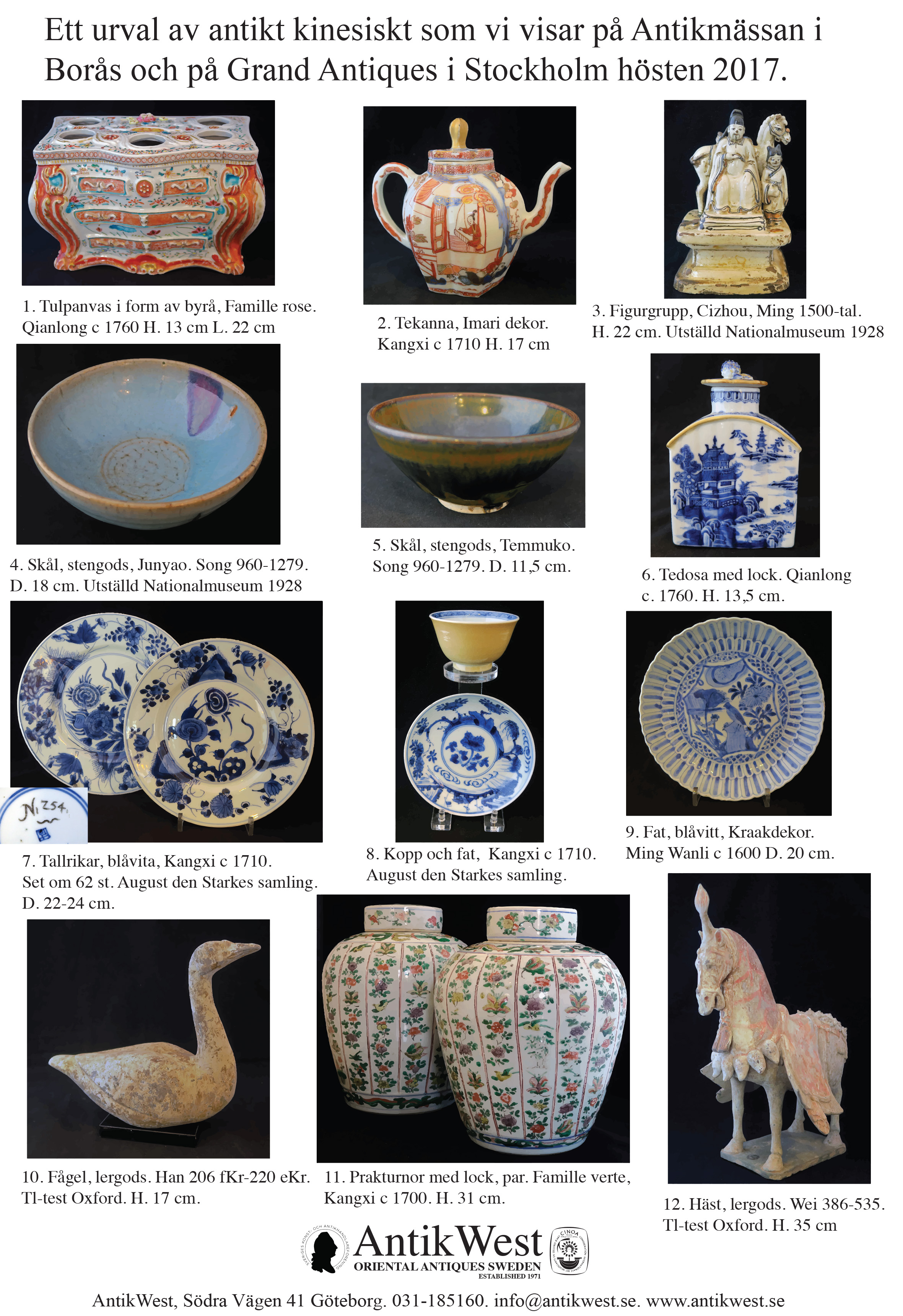 Ingår i Swedish Culture Year 2017 i Kina. Svenska nutida porslinsdesigner som verkar i Jingdezhen visar sina verk tillsammans med antikt porslin från AntikWests samlingar. Intressanta exempel på exportporslin från Kina till Sverige av det Svenska Ostindiska Compagniet under 1700-talet.