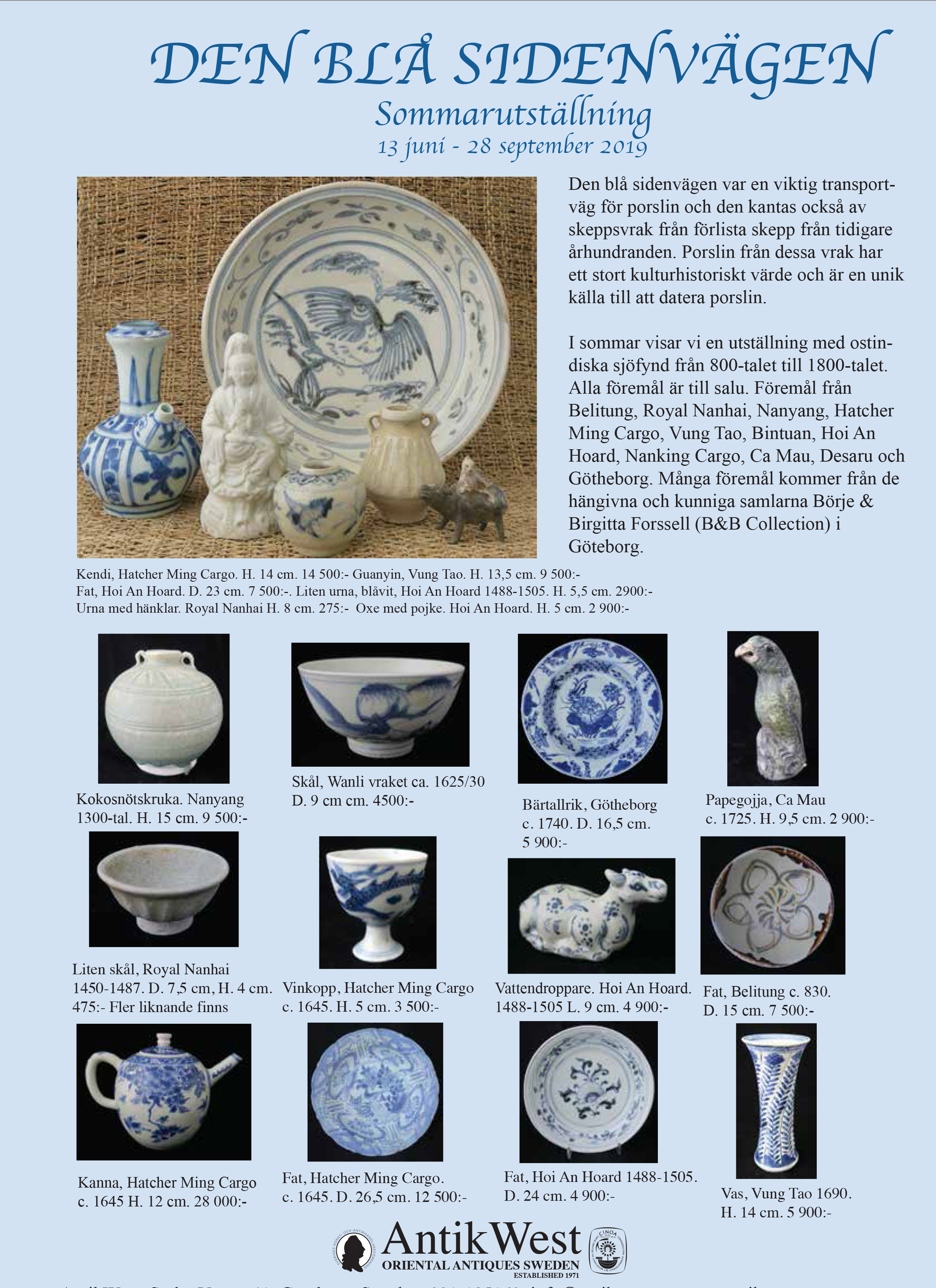 Utställning med ostindiska sjöfynd från 800-talet till 1800-talet. Alla föremål är till salu. Föremål med proveniens från Belitung, Royal Nanhai, Nanyang, Hatcher Ming Cargo, Vung Tao, Bintuan, Hoi An Hoard, Nanking Cargo, Ca Mau, Desaru och Götheborg. Många föremål kommer från de hängivna och kunniga samlarna Börje & Birgitta Forssell (B&B Collection) i Göteborg.